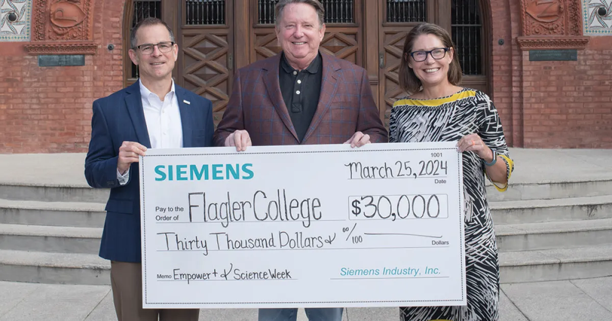 The grant includes $25,000 for Flagler College Professor Matt Brown’s San Sebastian River Water Quality Research Project. Additionally, Siemens gave $5,000 as the lead/title sponsor of Science Week, underscoring Siemens' commitment to fostering scientifi c education and innovation.