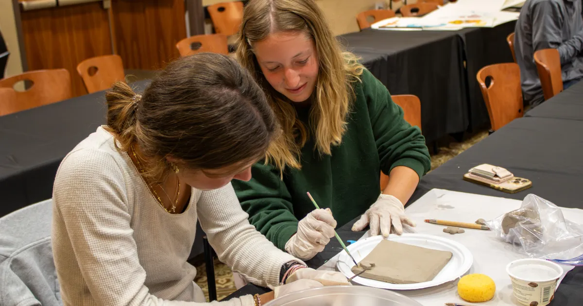 The workshop then shifted into a hands-on experience. Burgess demonstrated foundational techniques such as sprigging, a process that uses molds to add raised, decorative elements to clay surfaces. She also showed students how to build up, carve into, and apply texture to their tiles.